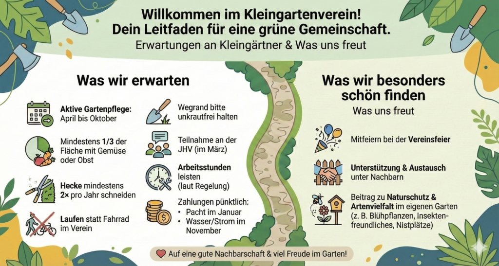 Ein Kleingartenverein lebt von seinen Mitgliedern! Wir freuen uns, wenn du Lust hast, dich einzubringen, sei es bei Vereinsaktionen, Sommerfesten oder bei gemeinsamen Projekten. Ein paar Stunden im Jahr für das Vereinsleben – das ist eine Investition, die sich auszahlt: in Freundschaften, fröhliche Begegnungen und jede Menge Spaß im Grünen.